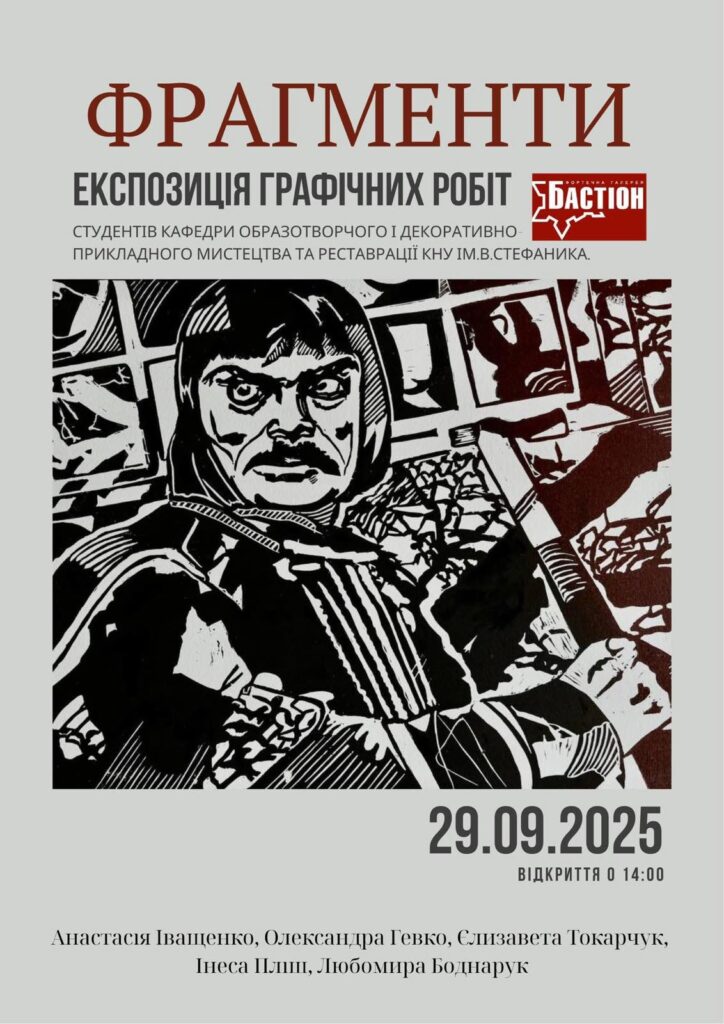 29 вересня 2025 р. у фортечній галереї «Бастіон» відбулося відкриття виставки «Фрагменти» виконаних студентами кафедри образотворчого і декоративно-прикладного мистецтва та реставрації Карпатського національного університету імені Василя Стефаника Анастасією Іващенко, Олександрою Гевко, Єлизаветою Токарчук, Інессою Пліш, Любомирою Боднарук. На виставці представлено біля тридцяти робіт з графіки виконаних переважно в техніці лінорит та мокуліто (викладач доц. Сандюк В.С.). Експозиція вражає розмаїттям художніх образів та стилістичних рішень, відображаючи творчий розвиток студентів і їхнє прагнення до самовираження. Виставка триватиме до 23 жовтня 2025 р., тож усі охочі мають змогу завітати та ознайомитися з творчими здобутками молодих художників.